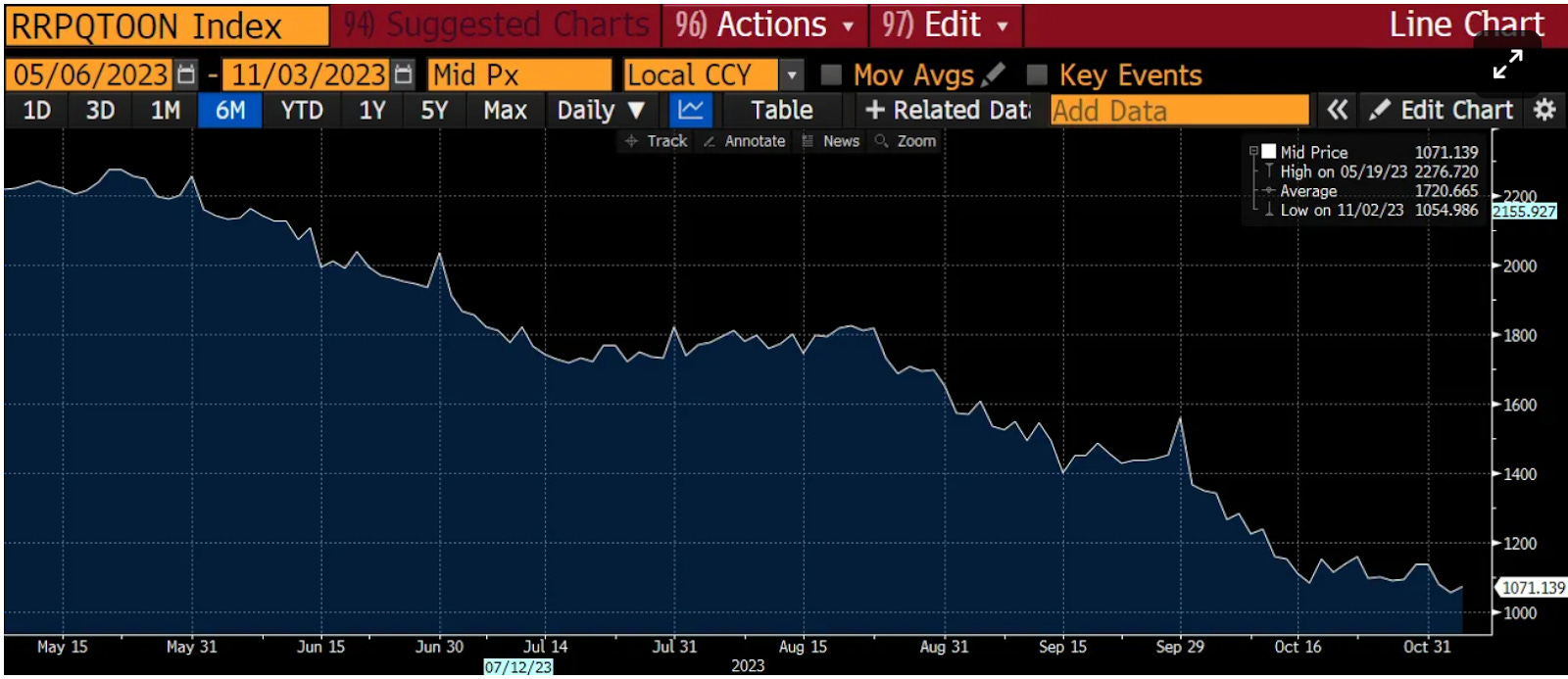 Since then the RRP has been drained from 2.1T -> 1T. Hayes thinks Yellen will drain it all