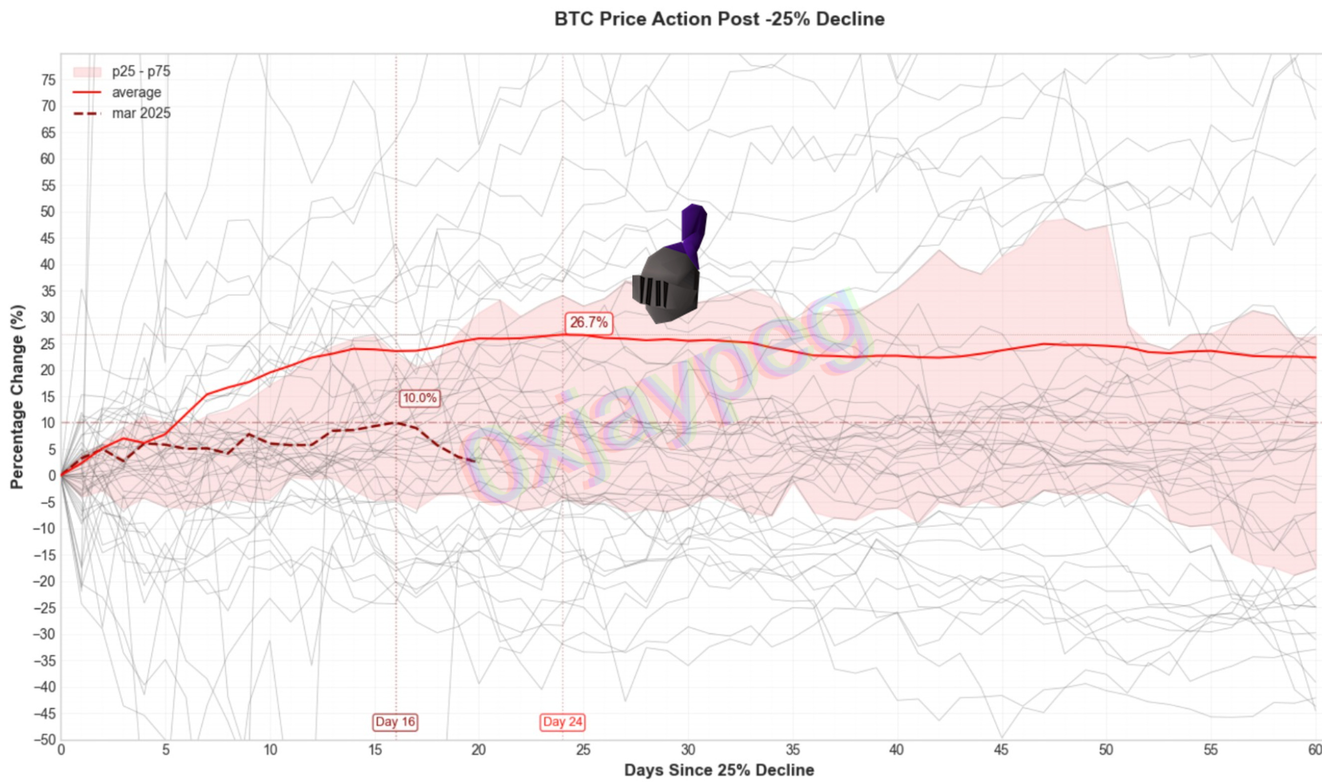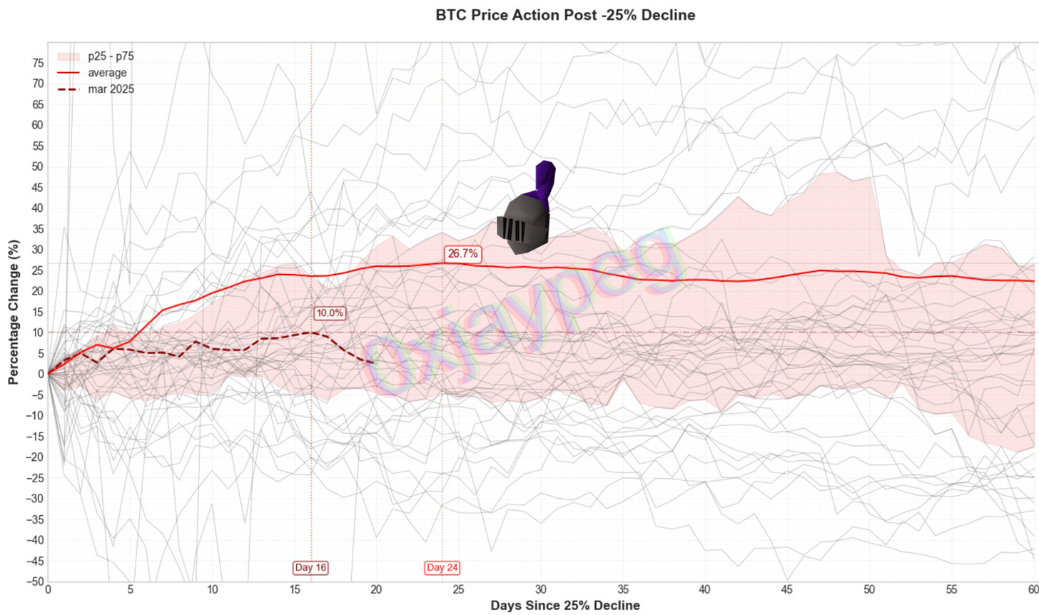 The numbers actually lines up well with how bitcoin price action performs after a -25% decline (see chart below)