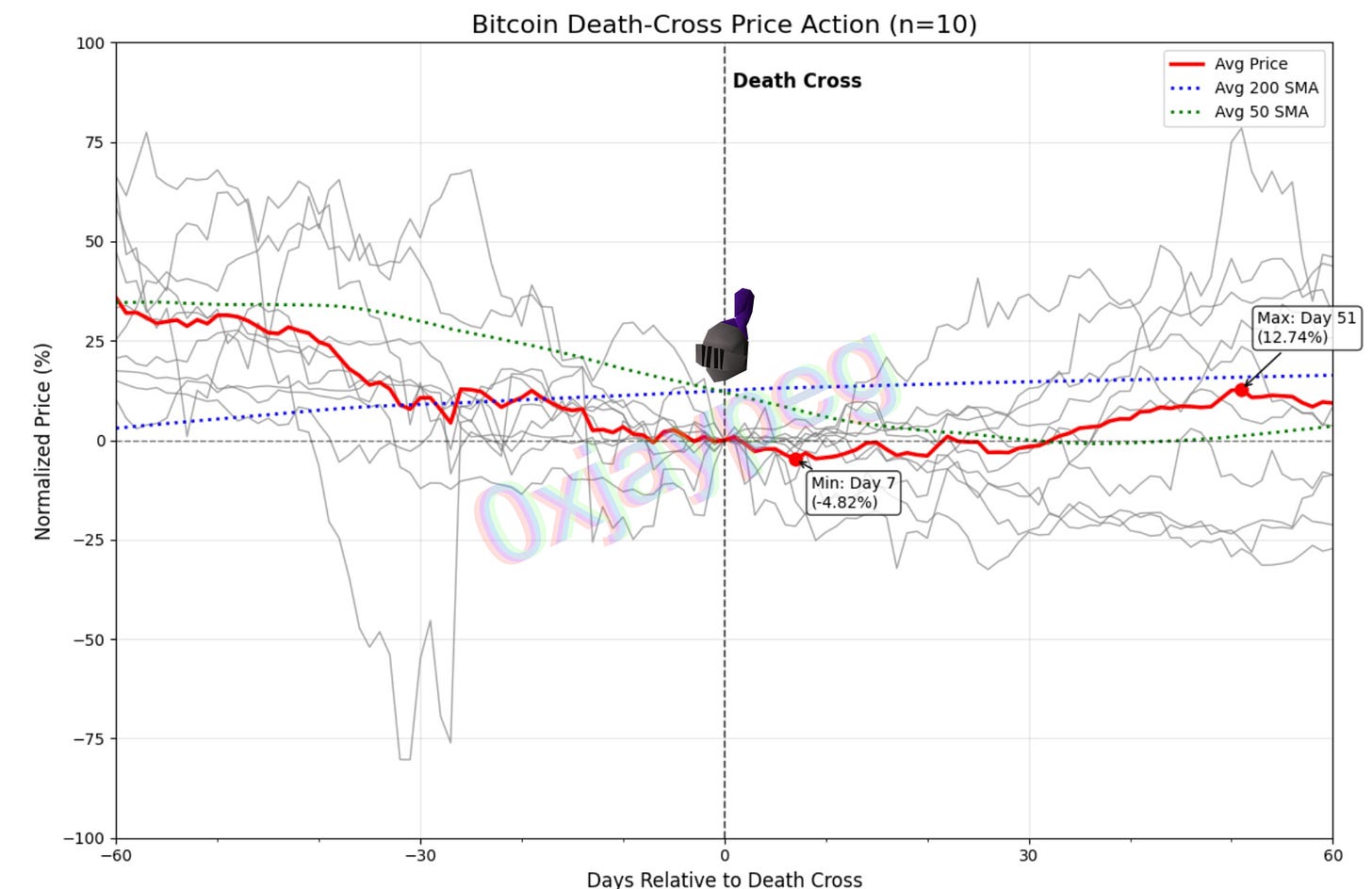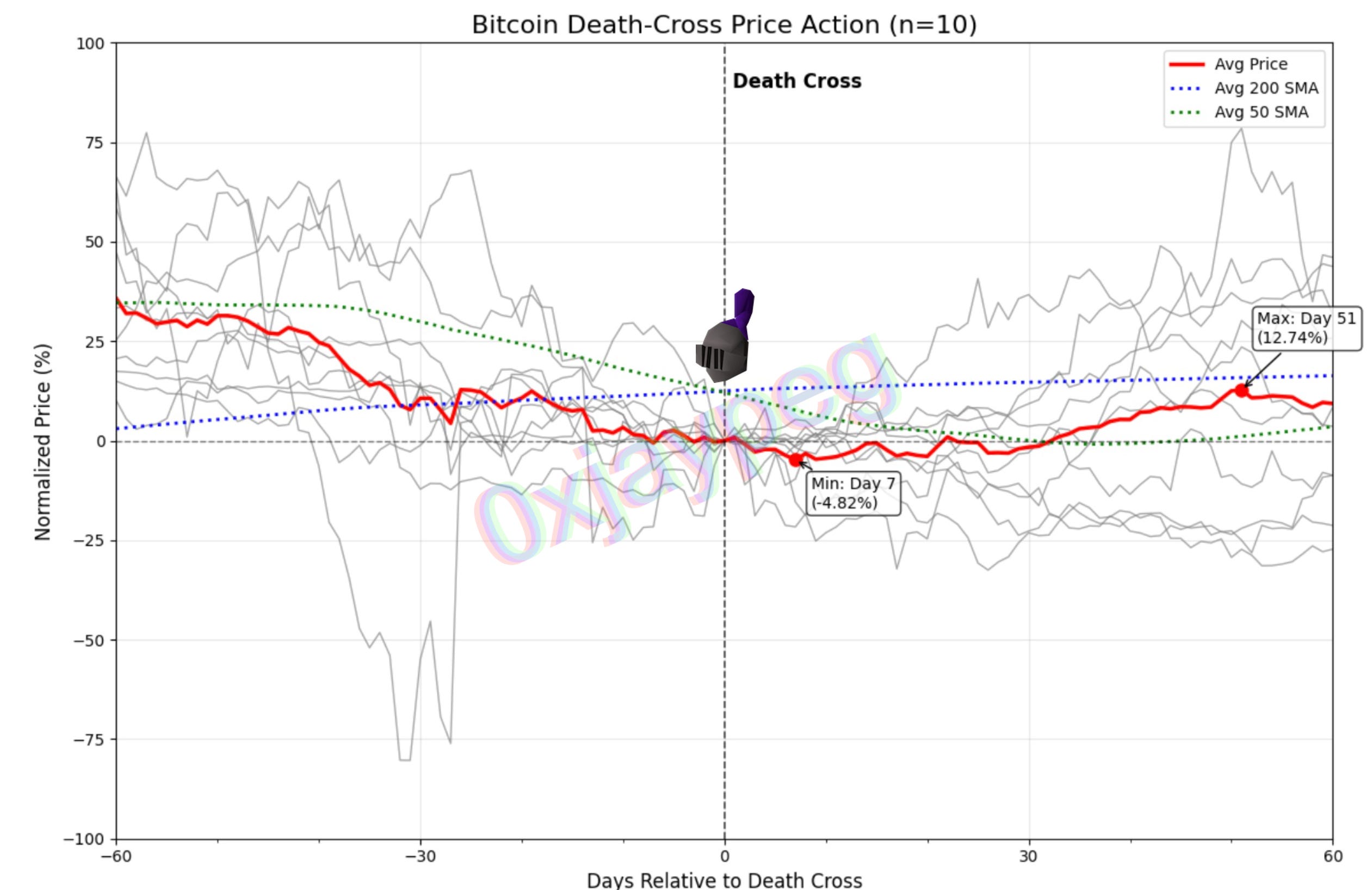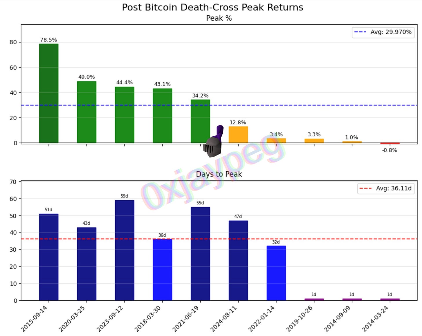 Additionally, it took 36 days (on average) for the peak post death cross to play out