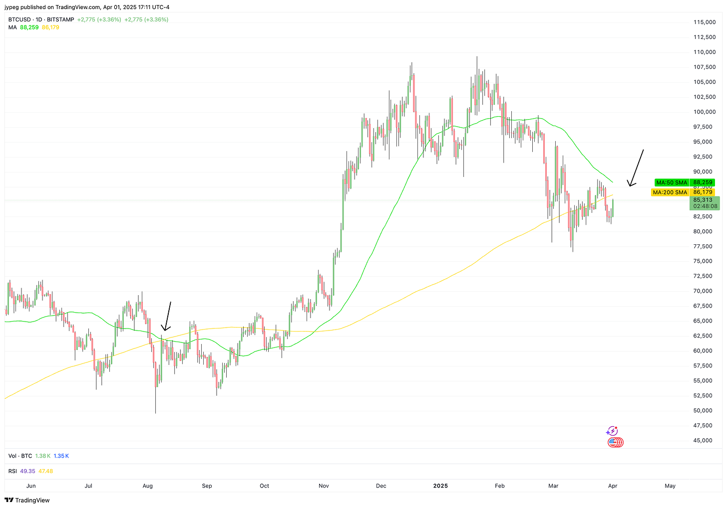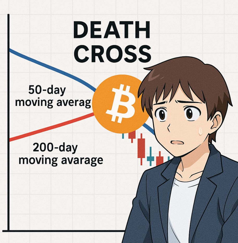 You can see that as we approach the death cross, there is a grind down in bitcoin price - we’ve seen the same thing in this instance. Bitcoin drew down from > 100k+ to the low 80k area.