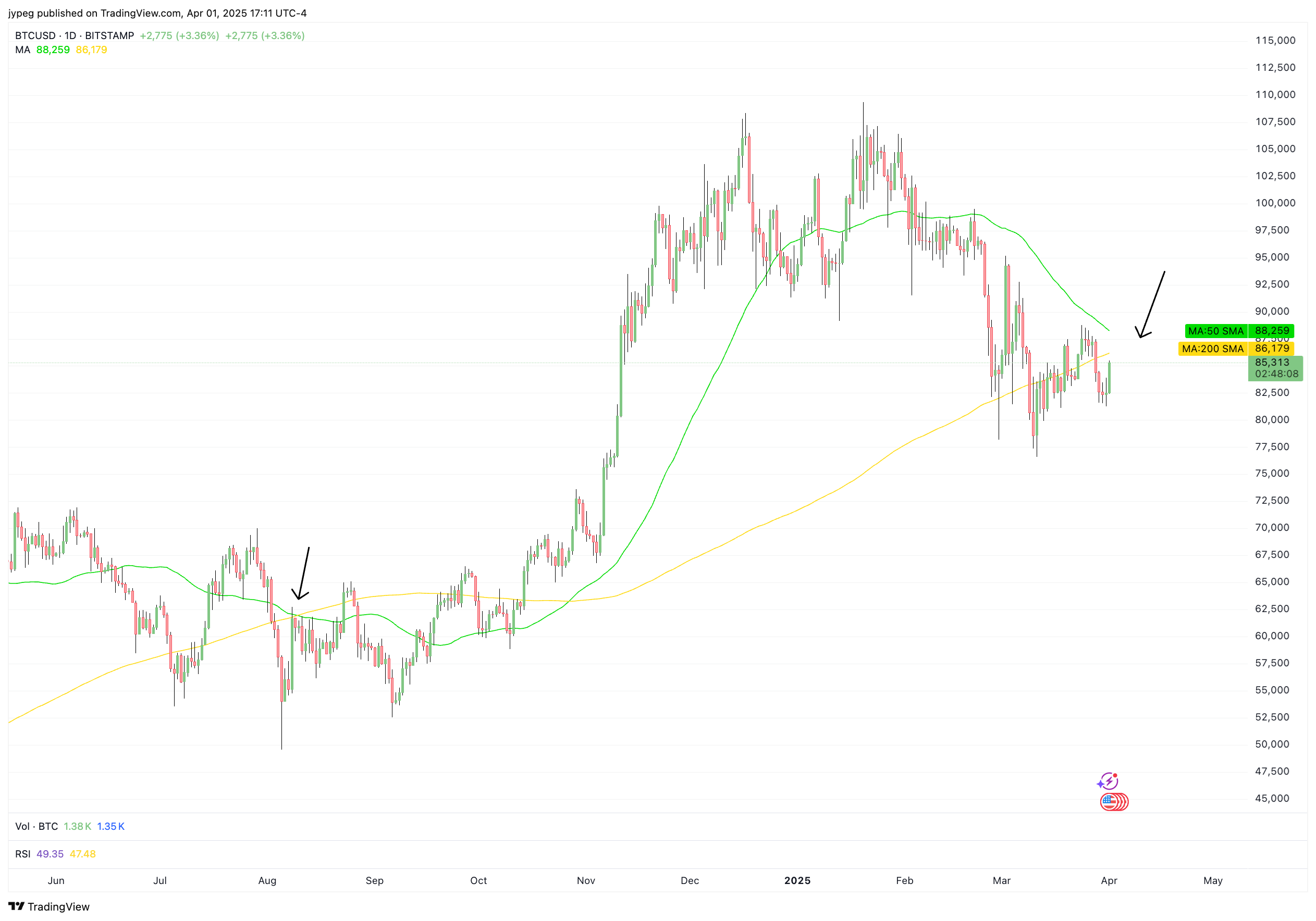 If we look at the bitcoin chart, its pretty clear that we are going to see a death-cross in the occur next week or so. If we estimate, the death cross should occur at 87k (where the moving averages intersect).