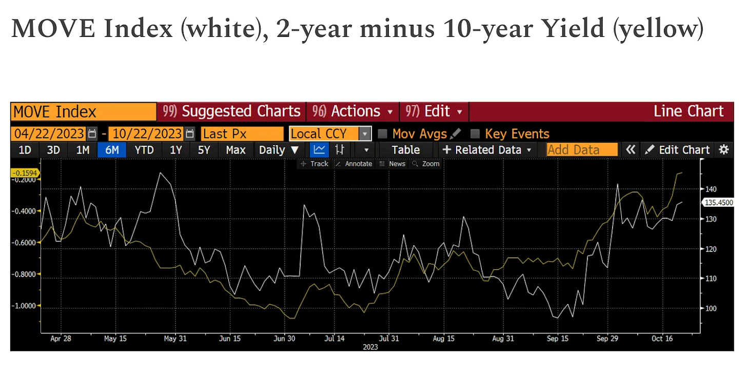 MOVE measures the bond volatility and you can see above that it is increasing in correlation with the spread between short vs. long term interest rates
